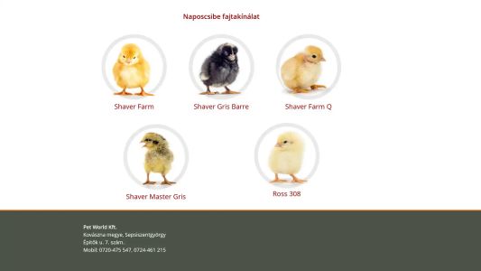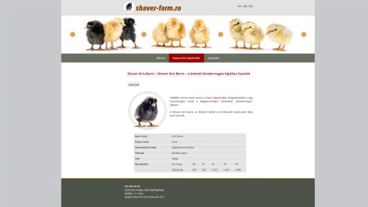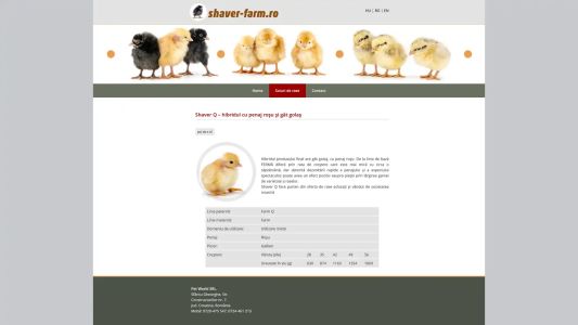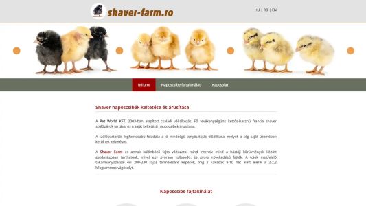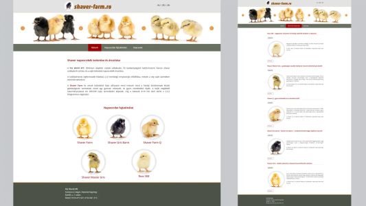 A shaver-farm.ro néven készítettünk weboldalt a sepsiszentgyörgyi Pet Word Kft. számára. A weboldal a Pet Word kft. egyik fő tevékenységét, a baromfi szülőpárok nevelését, tartását és a saját keltetésű naposcsibék értékesítését mutatja be.